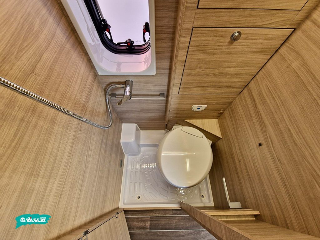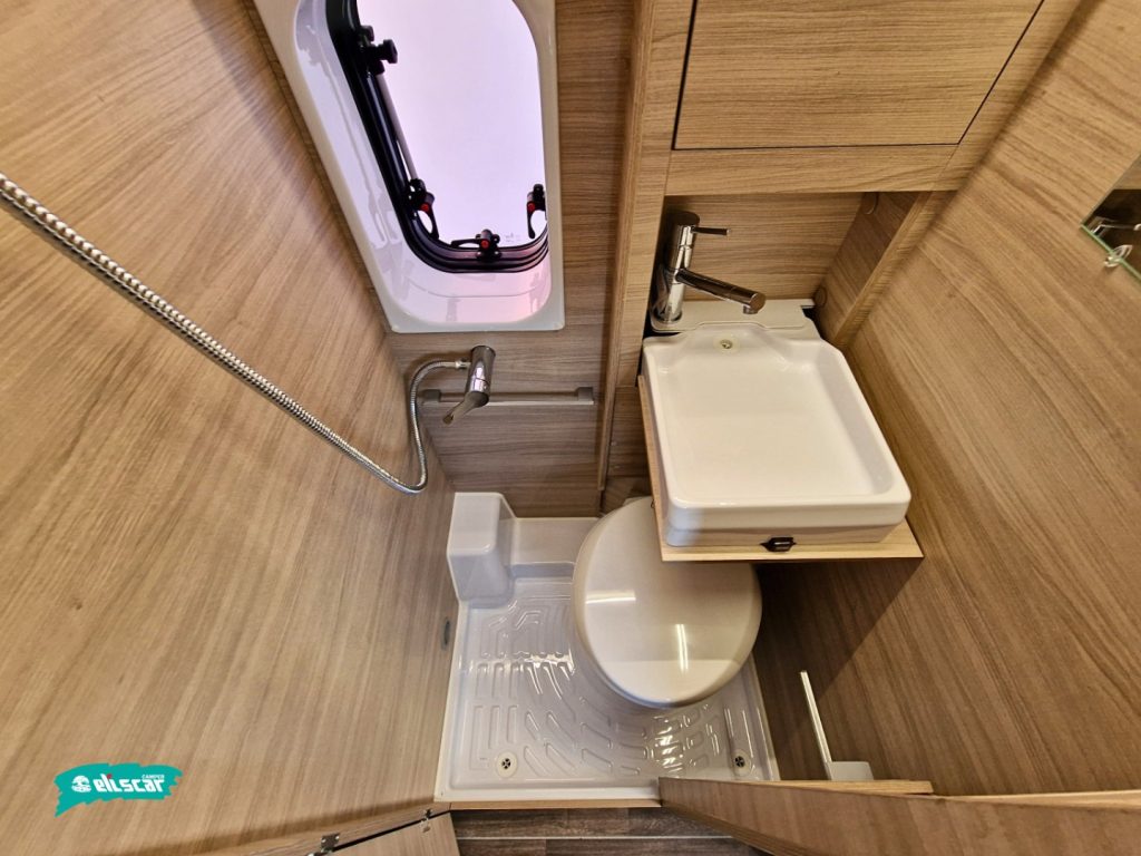 - Toilette compatta con doccia integrata, lavabo a scomparsa