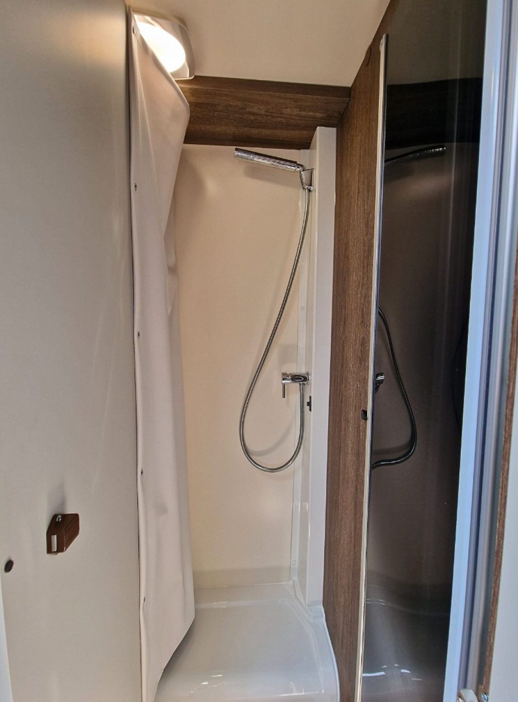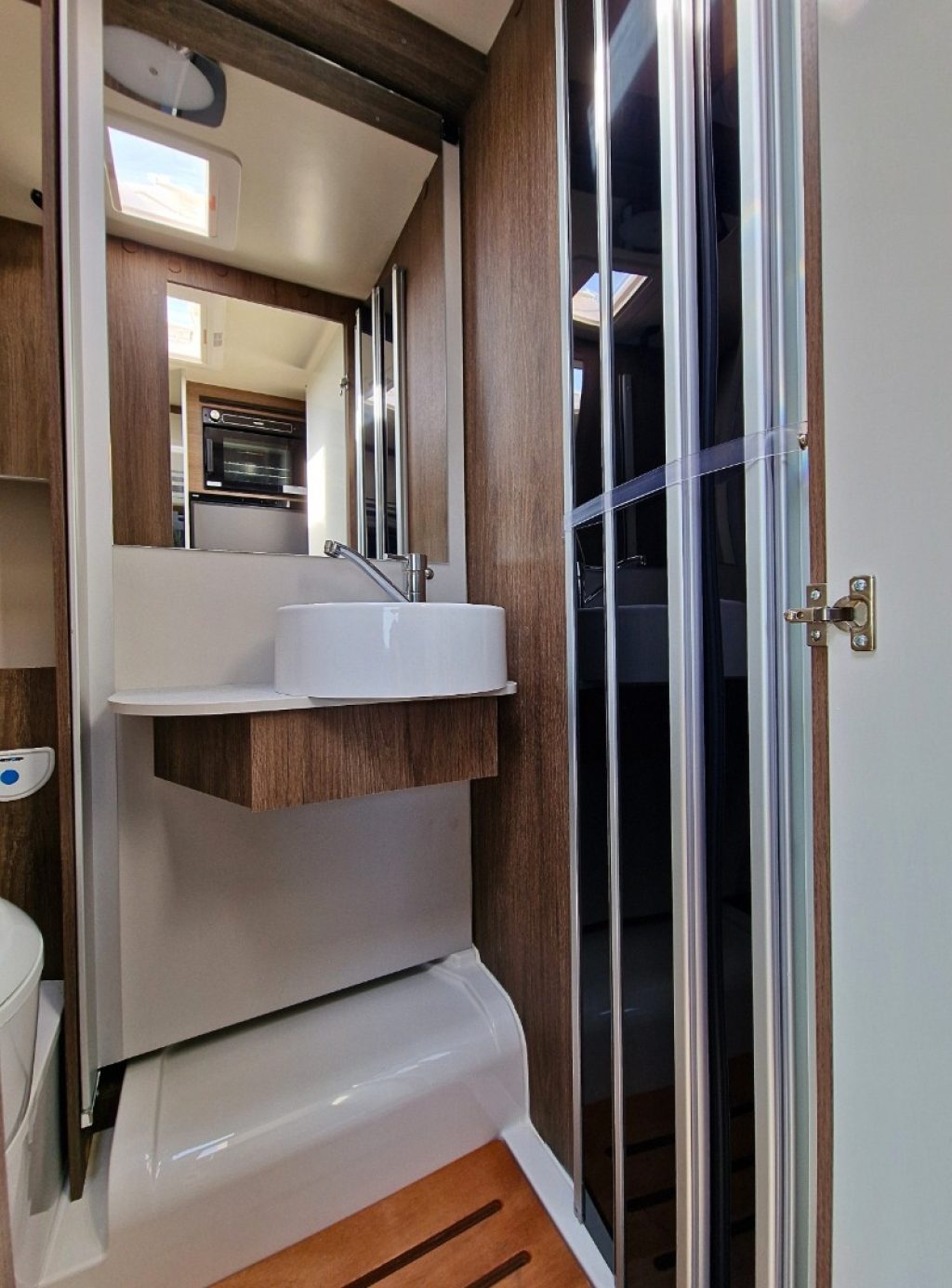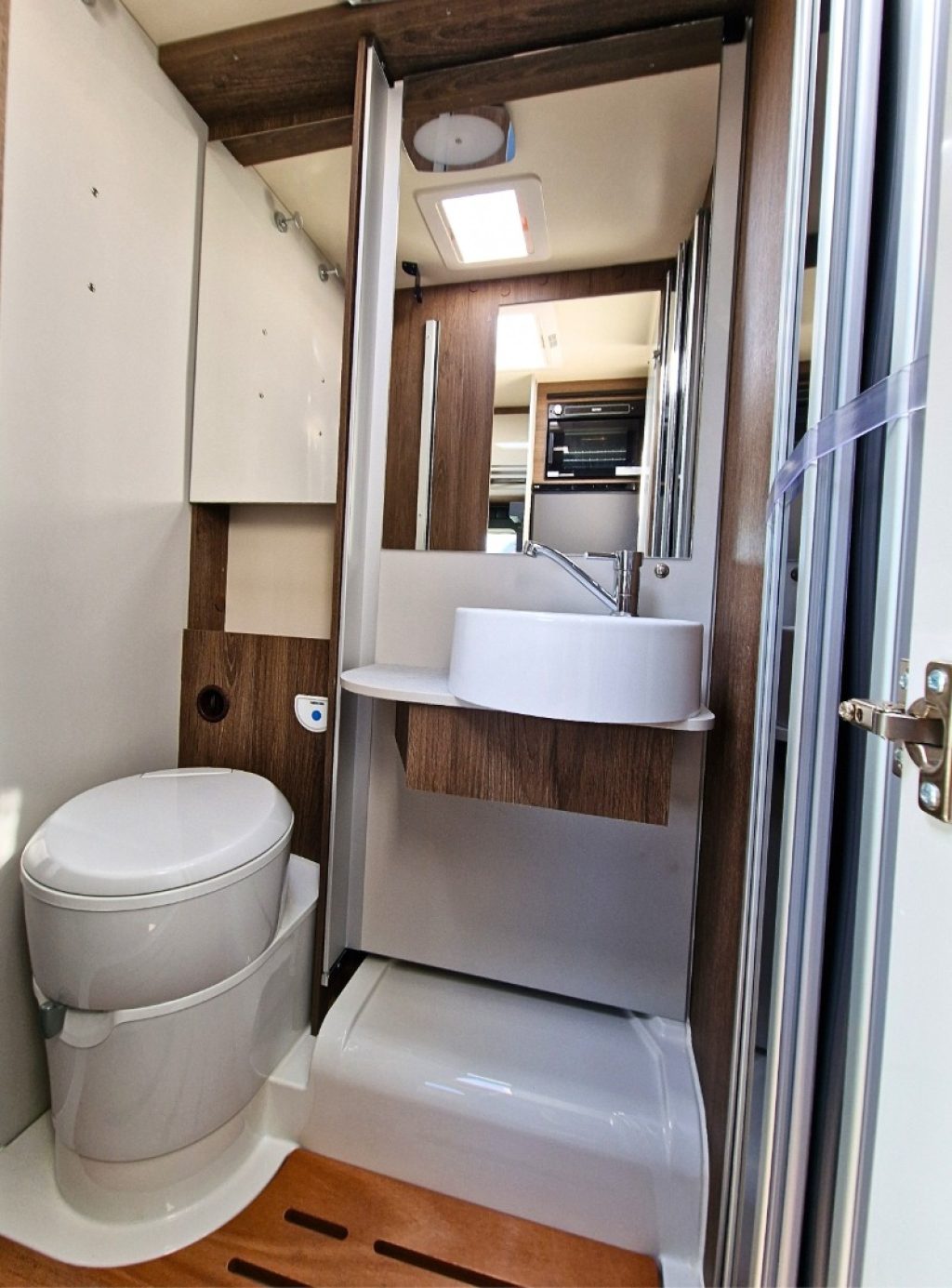 - Toilette doble face con parete mobile per isolare la doccia dal WC e dal lavabo